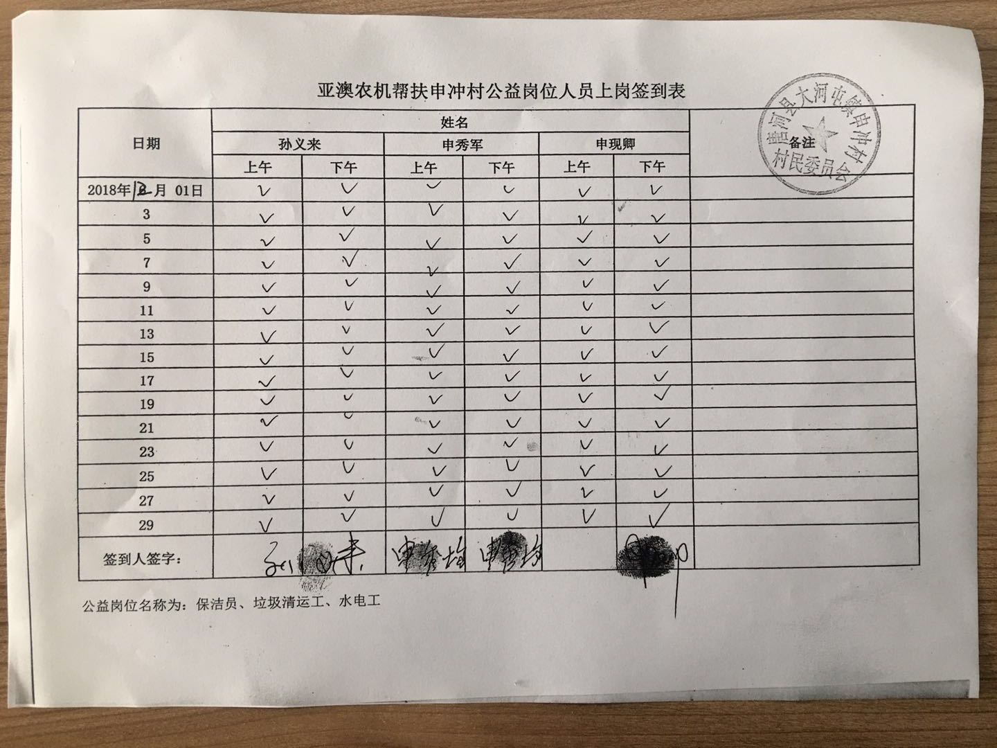 除此之外,我公司聯(lián)合村委會照顧一些特別貧困但有行動能力的老人為村部垃圾清運(yùn)、水電維修、村落清潔等,并為此購買公益崗位,每月定期給這些公益崗位發(fā)放工資,以確保他們的正常生活。