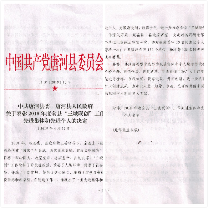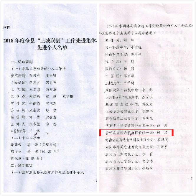 412日,唐河縣召開2018年度“三城聯(lián)創(chuàng)”總結(jié)大會。大會宣讀了表彰先進集體及先進個人的決定。亞澳農(nóng)機獲得2018年度國家園林縣城創(chuàng)建工作先進集體。