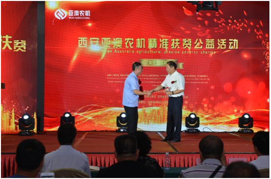 開機儀式上,中國農(nóng)機化協(xié)會還就“甘肅省蘭州市永登縣”精準扶貧工作給予亞澳高度的認可。永登縣團莊村屬干旱貧困山區(qū),全村現(xiàn)有7個村民小組,421戶、1696人。近年來,幫扶單位先后捐贈了30多臺(套)特色農(nóng)機具,但仍缺少大中型農(nóng)機具,農(nóng)機化服務(wù)能力不足,不能滿足農(nóng)業(yè)生產(chǎn)需求。此次中國農(nóng)業(yè)機械化協(xié)會聯(lián)合亞澳公司等有關(guān)單位向團莊村捐贈價值40多萬元農(nóng)業(yè)機械,必將對團莊和周邊鄉(xiāng)村農(nóng)業(yè)和農(nóng)村經(jīng)濟發(fā)展、全面建設(shè)小康社會起到很大地推進作用。